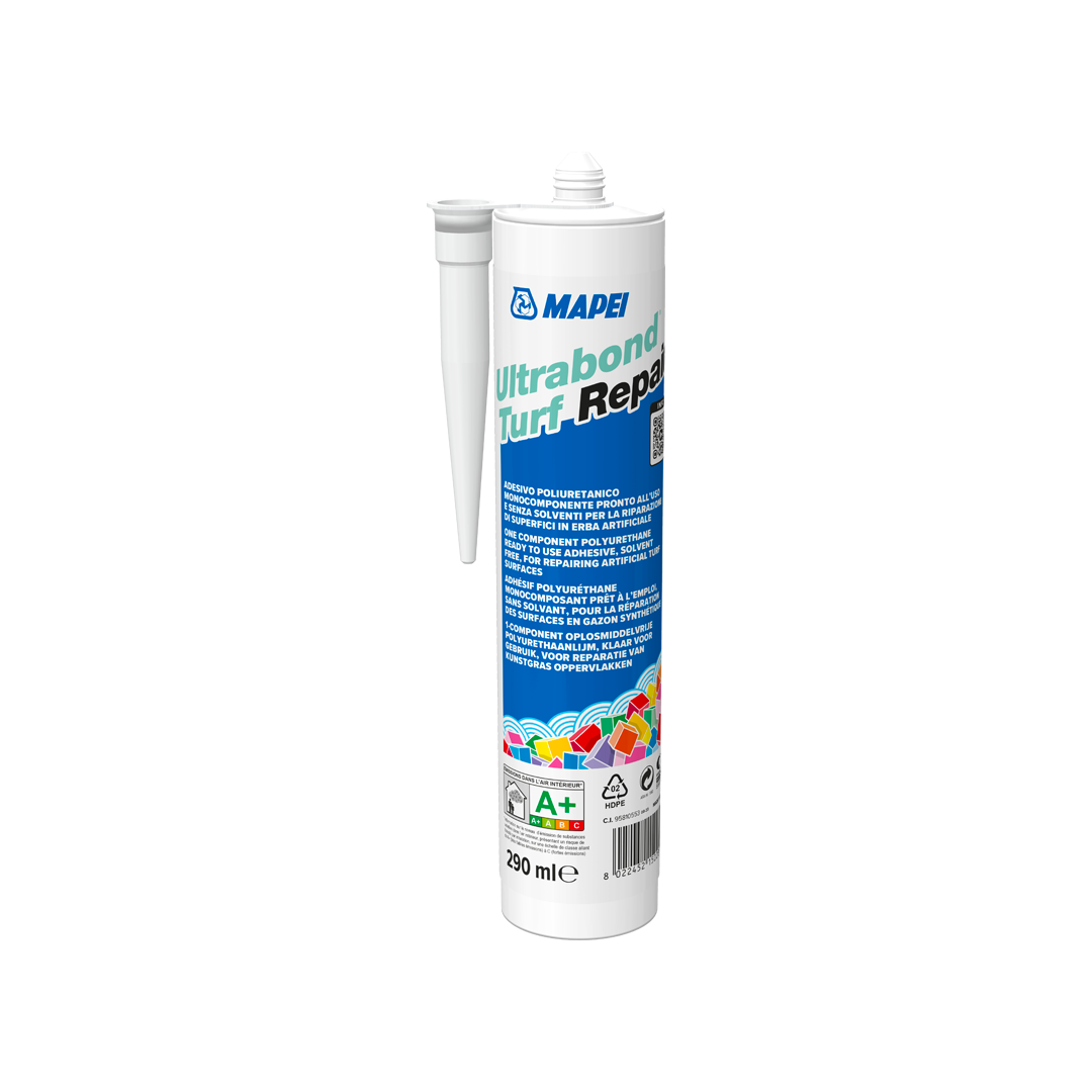 Adesivo poliuretanico igroindurente monocomponente, pronto all'uso. Consigliato per riparare piccole zone di erba sintetica, incollare perimetri, angoli e zone con fondo di cemento.